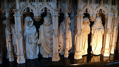 The lecture provided a wealth of new detail on both works, from how light grey marble is transformed to deep black marble (used for the tomb) by meticulous manual polishing to how these monuments were perceived by Carthusian monks who were inmates of the monastery at the time and Philip the Bold’s ambition to assert his dynastic claims through iconic monumental work. Whilst many of you will be familiar with the Well of Moses as this monument is featured in most Northern Renaissance books and magazines, the Tomb of Philip the Bold was a real discovery for us yesterday, and the 41 pleurants (the white marble mourner statues) that are featured in the bottom half of the tomb are truly exceptional: