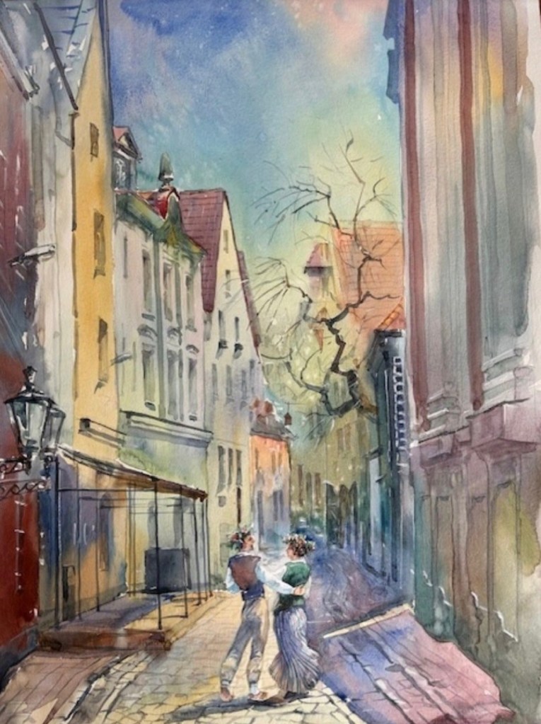 The painting The Roots of Baltic Spirit beautifully weaves together architecture, memory, and cultural tradition. The scene is set in the cobblestone streets of Riga’s Old Town, where medieval spires and ornate façades rise with dignity, evoking Latvia’s layered history as a crossroads of trade, culture, and resilience. The cool tones of the stone buildings are balanced with the warmth of golden light, suggesting both endurance and hope.